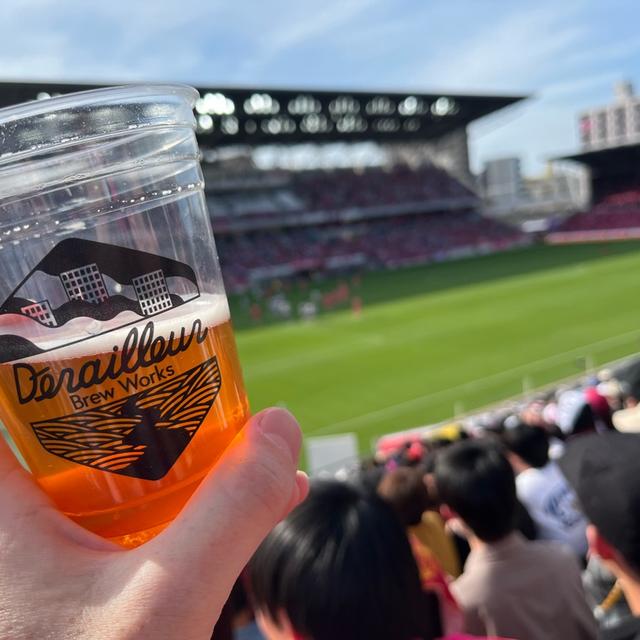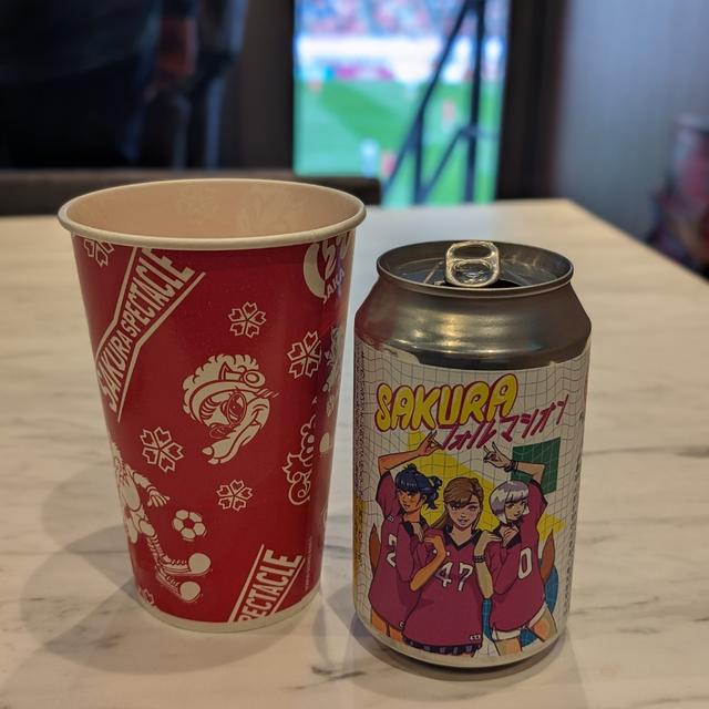 ヨドコウ桜スタジアム、うみねこスタンドのケータリングカーで先行販売中のセレッソコラボビール。 暑い日にラガーは沁みる🍺