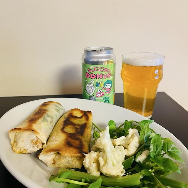 カレーと豆とひき肉を煮込んでクレソンを入れたものを春巻の皮で包んだ妻の食材消化料理だけれど、とてもおいしかった!