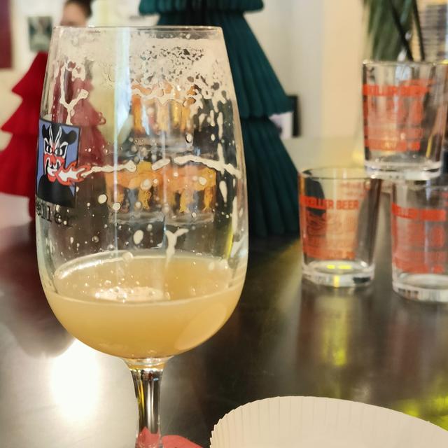鮮やかな黄色で濁った色。 匂いははっきりと、入口は少し苦く、ミルクのようなライムの香り、口は少し甘くて脂っぽい