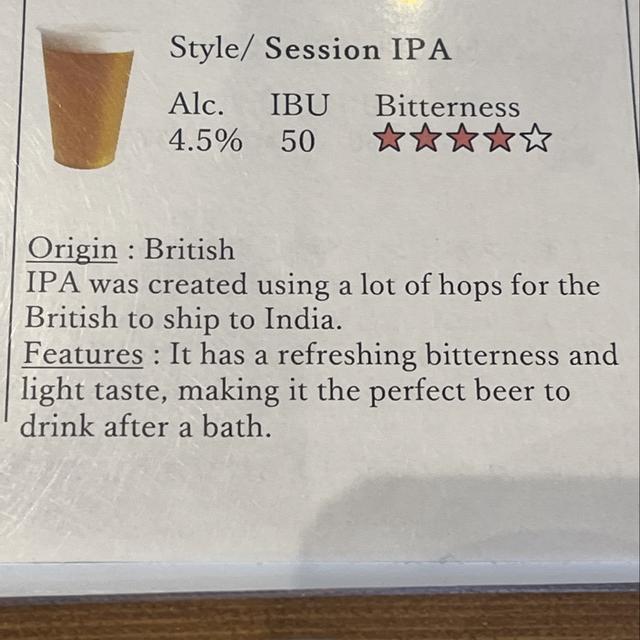 伊耀館IPAに非常に似ており、フルーティーな味わいですが少し花の香りが強く、モルティは控えめで、ホップの風味は強いです